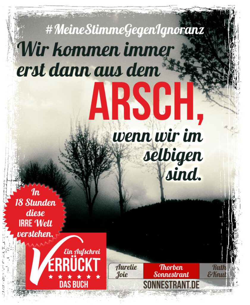 Dieser Planet kommt viel besser ohne Menschen aus und je eher wir uns endgültig die Köpfe einschlagen, umso schneller kann Mutter Erde mit der Regeneration anfangen. Eigentlich hat sie uns ein verdammt schönes Geschenk gemacht. Das Leben auf und mit ihr könnten wir genießen. Wir müssten Millionen Jahre reisen in völlig unbekannte Richtung, um vielleicht einen ähnlichen Planeten zu finden. Doch wir machen es uns einfach nur schwer, schreien uns gegenseitig an, wie wenig wir voneinander halten, ziehen aus Lautstärke Gewinn durch Reichweite und ergehen uns in Ignoranz. Die Alternative für diese Welt lautet deshalb: Entweder wir kommen JETZT aus dem Arsch oder wir sind demnächst in selbigem.