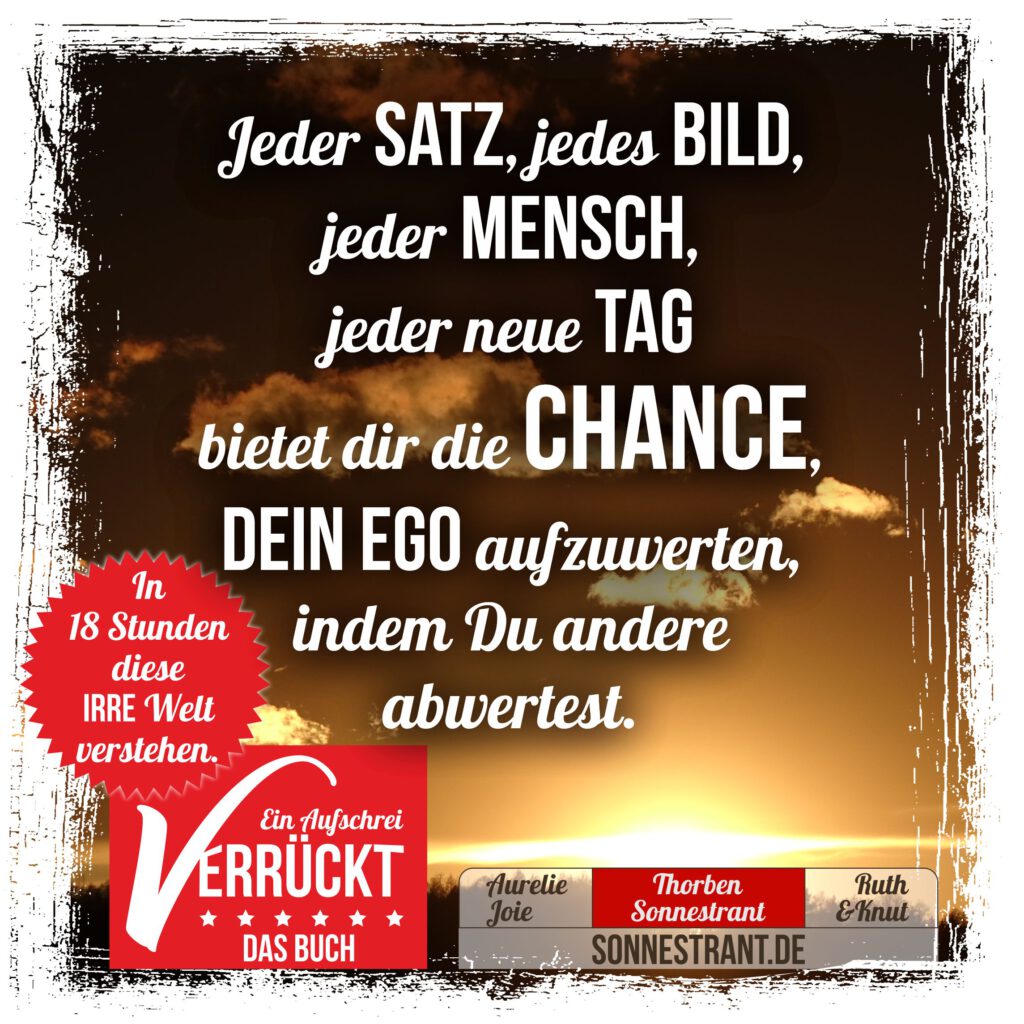 Es geht (fast) IMMER um unser Ego, um unseren Selbstwert. Was immer wir machen, soll unseren Selbstwert wachsen lassen. Wir helfen anderen nicht aus Nächstenliebe, sondern weil wir uns dabei selbst besser fühlen, unser Ego aufwerten. Auch ich hätte dies alles hier nicht geschrieben, wenn mein Unterbewusstsein nicht viel Beifall erwarten würde. (Wobei es auch sagt: „Sei nicht enttäuscht, wenn du auf die Nase fällst.“)